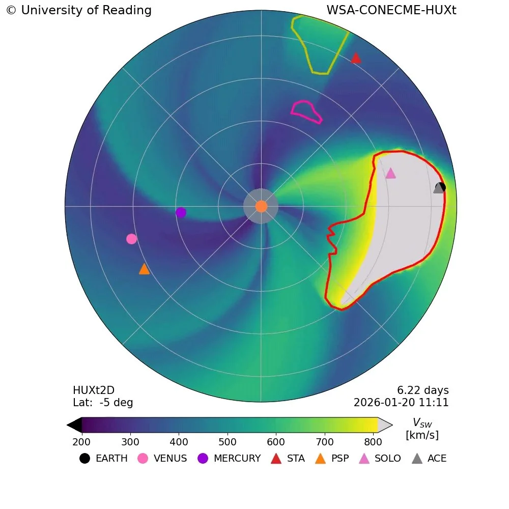 Following Sunday's major X2 solar flare on the sun Noaa Space Weather prediction center is forecasting G3 storm conditions. Based on the latest HUXt forecast model a large CME will hit earth on Tuesday afternoon and evening with G4 storm conditions possible.
